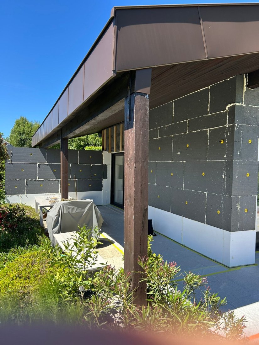 Ce type de projet d’agrandissement présente plusieurs enjeux techniques et réglementaires. La principale problématique résidait dans l’intégration harmonieuse de l’extension à la structure existante, tant sur le plan architectural que thermique. Il était essentiel d’assurer une parfaite étanchéité à l’air et à l’eau entre l’ancien et le neuf, tout en veillant au maintien d’une isolation optimale. L’adaptation des fondations, le respect des distances avec les limites de propriété et la gestion des apports de lumière naturelle étaient également des défis majeurs. Nous avons aussi dû composer avec les exigences du Plan Local d’Urbanisme (PLU) pour garantir la conformité du projet.