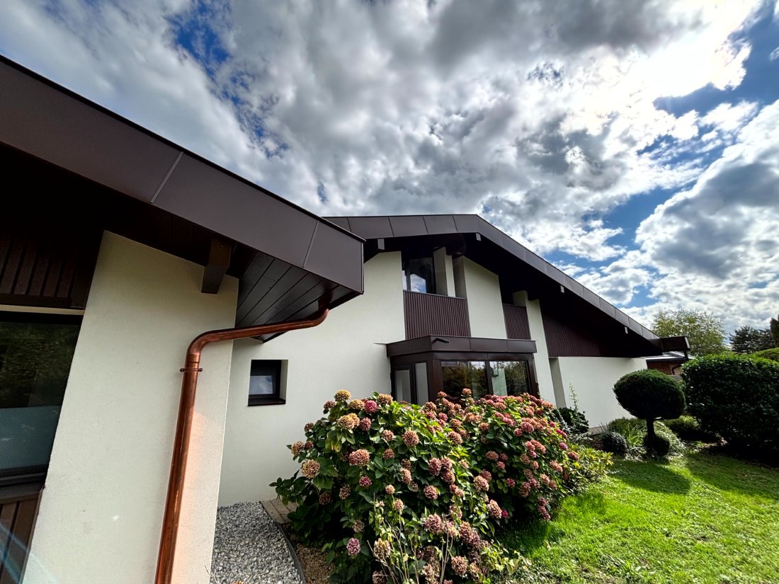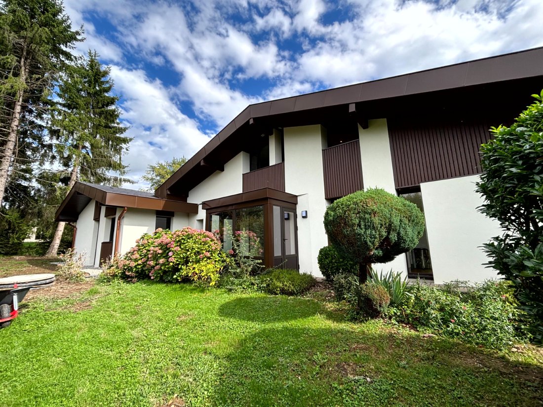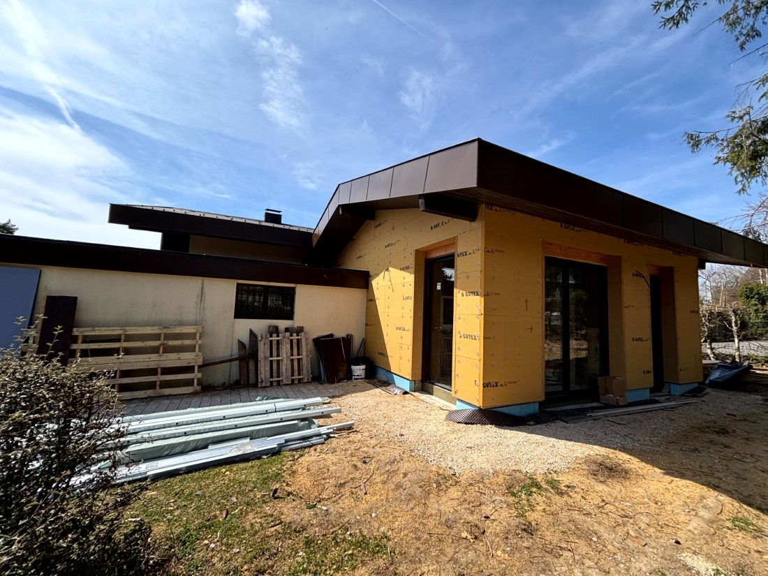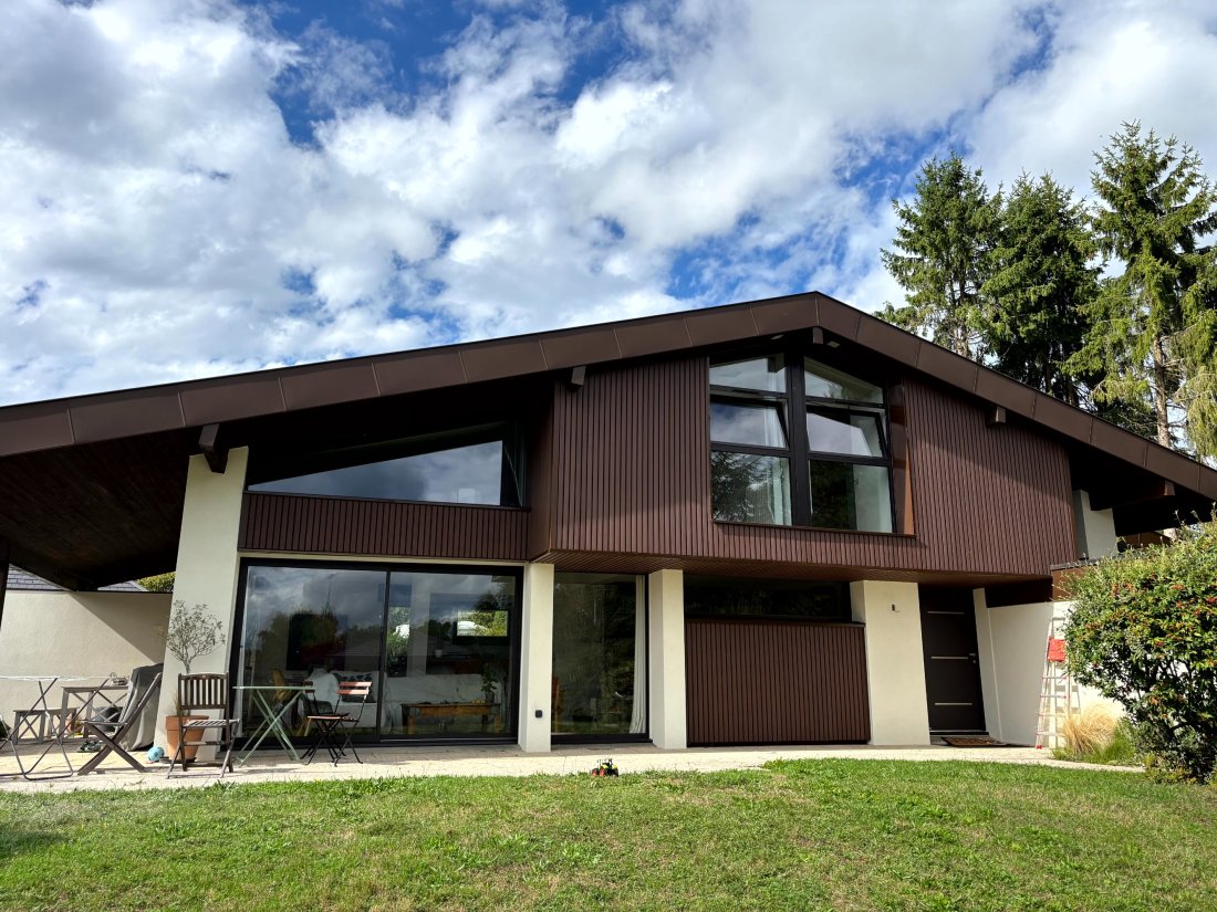 Extension contemporaine en ossature bois à Cruseille, intégrée harmonieusement à une maison existante. Grands vitrages, finitions soignées et mise en valeur du cadre naturel environnant.